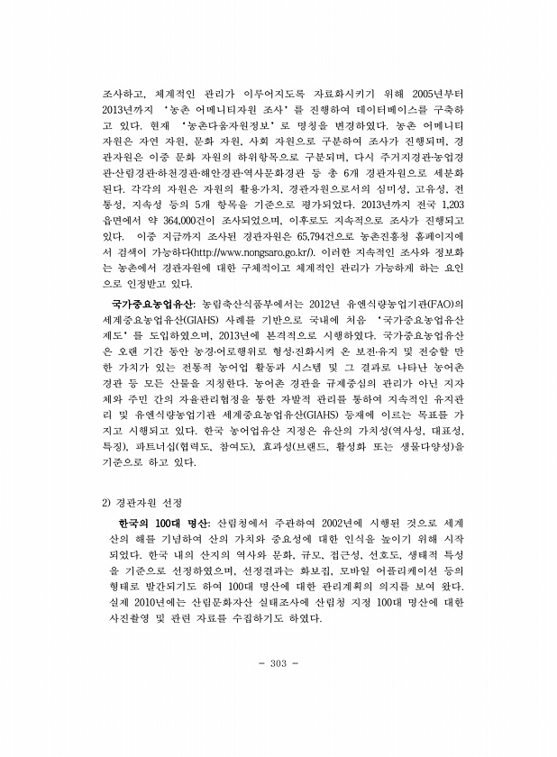 303 조사하고, 체계적인 관리가 이루어지도록 자료화시키기 위해 2005년부터 2013년까지 ‘농촌 어메니티자원 조사’를 진행하여 데이터베이스를 구축하 고 있다. 현재 ‘농촌다움자원정보’로 명칭을 변경하였다. 농촌 어메니티 자원은 자연 자원, 문화 자원, 사회 자원으로 구분하여 조사가 진행되며, 경 관자원은 이중 문화 자원의 하위항목으로 구분되며, 다시 주거지경관?농업경 관?산림경관?하천경관?해안경관?역사문화경관 등 총 6개 경관자원으로 세분화 된다. 각각의 자원은 자원의 활용가치, 경관자원으로서의 심미성, 고유성, 전 통성, 지속성 등의 5개 항목을 기준으로 평가되었다. 2013년까지 전국 1,203 읍면에서 약 364,000건이 조사되었으며, 이후로도 지속적으로 조사가 진행되고 있다. 이중 지금까지 조사...