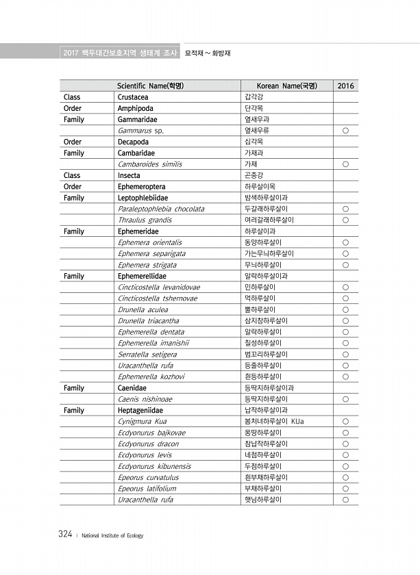 2017 백두대간보호지역 생태계 조사 묘적재 화방재 324 ? National Institute of Ecology Scientific Name 학명 Korean Name 국명 2016 Class Crustacea 갑각강 Order Amphipoda 단각목 Family Gammaridae 옆새우과 Gammarus sp. 옆새우류 ○ Order Decapoda 십각목 Family Cambaridae 가재과 Cambaroides similis 가재 ○ Class Insecta 곤충강 Order Ephemeroptera 하루살이목 Family Leptophlebiidae 밤색하루살이과 Paraleptophlebia chocolata 두갈래하루살이 ○ Thraulus grandis 여러갈래하루살이 ○ Family ...