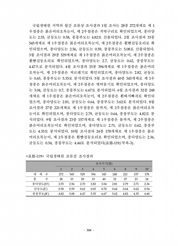 304 국립생태원 지역의 월간 조류상 조사결과 1월 조사는 28종 272개체로 제 1 우점종은 붉은머리오목눈이, 제 2우점종은 직박구리로 확인되었으며, 종다양 도는 2.55, 균등도는 0.58, 종풍부도는 4.82로 산출되었다. 2월 조사결과 33종 545개체로 제 1우점종은 붉은머리오목눈이, 제 2우점종은 흰뺨검둥오리로 확 인되었으며, 종다양도는 2.56, 균등도는 0.59, 종풍부도는 5.08로 산출되었다. 3월 조사결과 29종 529개체로 제 1우점종은 붉은머리오목눈이, 제 2우점종은 흰뺨검둥오리로 확인되었으며, 종다양도는 2.7, 균둥도는 0.62, 종풍부도는 4.47으로 분석되었다. 4월 조사결과 33종 394개체로 제 1우점종은 붉은머리 오목눈이, 제 2우점종은 찌르레기로 확인되었으며, 종다양도는...