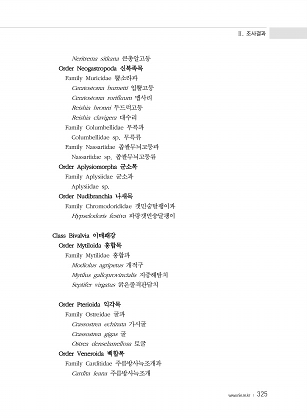 Ⅱ. 조사결과 www.nie.re.kr ? 325 Neritrema sitkana 큰총알고둥 Order Neogastropoda 신복족목 Family Muricidae 뿔소라과 Ceratostoma burnetti 입뿔고둥 Ceratostoma rorifluum 맵사리 Reishia bronni 두드럭고둥 Reishia clavigera 대수리 Family Columbellidae 무륵과 Columbellidae sp. 무륵류 Family Nassariidae 좁쌀무늬고둥과 Nassariidae sp. 좁쌀무늬고둥류 Order Aplysiomorpha 군소목 Family Aplysiidae 군소과 Aplysiidae sp. Order Nudibranchia 나새목 Family Chromodorididae 갯...