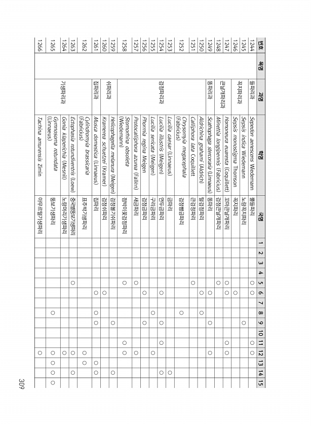 309 번호 목명 과명 학명 국명 1 2 3 4 5 6 7 8 9 10 11 12 13 14 15 1244 들파리과 Sepedon aenescens Wiedemann 뿔들파리 ○ ○ ○ ○ 1245 꼭지파리과 Sepsis indica Wiedemann 노랑꼭지파리 ○ 1246 Sepsis monostigma Thomson 꼭지파리 ○ 1247 큰날개파리과 Homoneura euaresta Coquillett 꼬마큰날개파리 ○ ○ ○ ○ 1248 Minettia longipennis Fabricius 검정큰날개파리 ○ 1249 똥파리과 Scathophaga stercoraria Linnaeus 똥파리 ○ ○ ○ 1250 검정파리과 Aldrichina grahami Aldrich 털검정파리 ○ ○ 1251 Ca...