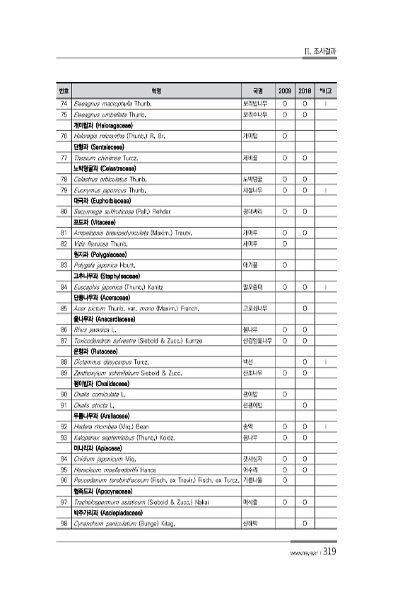II. 조사결과 www.nie.re.kr ?319 번호 학명 국명 2009 2018 *비고 74 Elaeagnus macrophylla Thunb. 보리밥나무 O O Ⅰ 75 Elaeagnus umbellata Thunb. 보리수나무 O O 개미탑과 Haloragaceae 76 Haloragis micrantha Thunb. R. Br. 개미탑 O 단향과 Santalaceae 77 Thesium chinense Turcz. 제비꿀 O O 노박덩굴과 Celastraceae 78 Celastrus orbiculatus Thunb. 노박덩굴 O O 79 Euonymus japonicus Thunb. 사철나무 O O Ⅰ 대극과 Euphorbiaceae 80 Securinega suffruticosa Pall. Re...