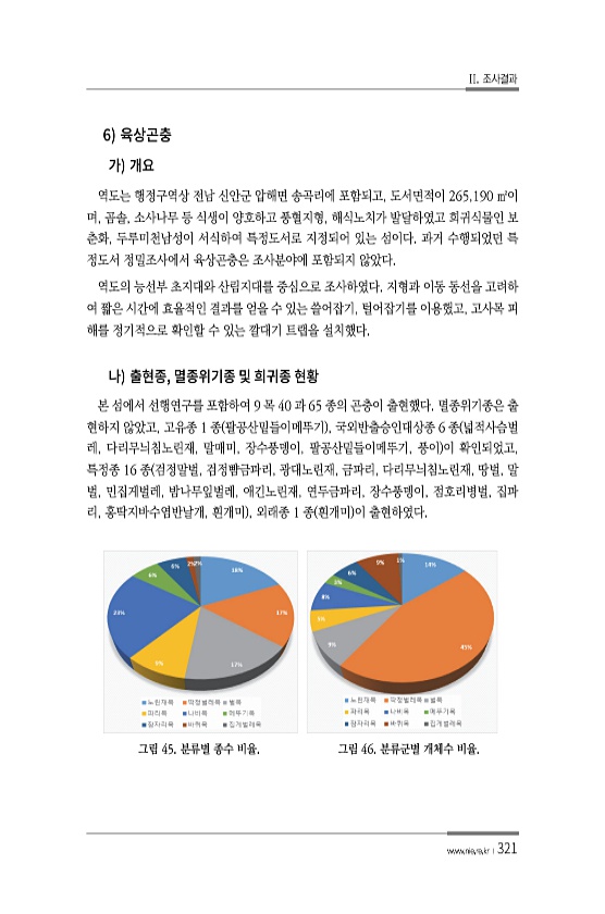 II. 조사결과 www.nie.re.kr ?321 6 역도는 행정구역상 전남 신안군 압해면 송곡리에 포함되고, 도서면적이 265,190 ㎡이 며, 곰솔, 소사나무 등 식생이 양호하고 풍혈지형, 해식노치가 발달하였고 희귀식물인 보 춘화, 두루미천남성이 서식하여 특정도서로 지정되어 있는 섬이다. 과거 수행되었던 특 정도서 정밀조사에서 육상곤충은 조사분야에 포함되지 않았다. 역도의 능선부 초지대와 산림지대를 중심으로 조사하였다. 지형과 이동 동선을 고려하 여 짧은 시간에 효율적인 결과를 얻을 수 있는 쓸어잡기, 털어잡기를 이용했고, 고사목 피 해를 정기적으로 확인할 수 있는 깔대기 트랩을 설치했다. , 본 섬에서 선행연구를 포함하여 9 목 40 과 65 종의 곤충이 출현했다. 멸종위기종은 출 현하지 않았고, 고유...