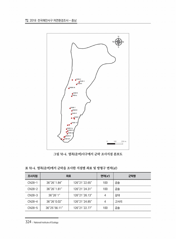 2018 전국해안사구 자연환경조사 충남 324 ? National Institute of Ecology 그림 Ⅵ-4. 열목 운여 사구에서 군락 조사지점 분포도 조사지점 좌표 면적 ㎡ 군락명 CN28-1 36°26′1.84″ 126°21′22.65″ 100 곰솔 CN28-2 36°26′1.81″ 126°21′24.31″ 100 곰솔 CN28-3 36°26′1″ 126°21′26.13″ 4 갈대 CN28-4 36°26′0.02″ 126°21′24.85″ 4 고사리 CN28-5 36°25′56.11″ 126°21′22.77″ 100 곰솔 표 Ⅵ-4. 열목 운여 에서 군락을 조사한 지점별 좌표 및 방형구 면적 ㎡