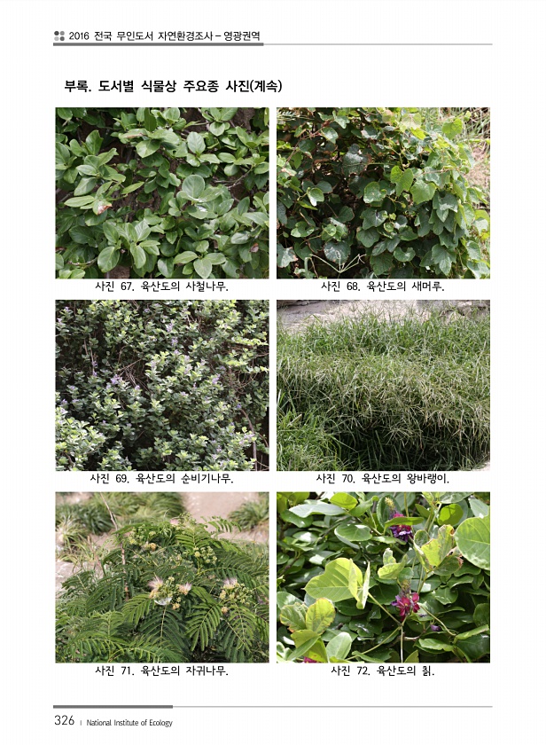 2016 전국 무인도서 자연환경조사 영광권역 326 ? National Institute of Ecology 부록. 도서별 식물상 주요종 사진 계속 사진 67. 육산도의 사철나무. 사진 68. 육산도의 새머루. 사진 69. 육산도의 순비기나무. 사진 70. 육산도의 왕바랭이. 사진 71. 육산도의 자귀나무. 사진 72. 육산도의칡.
