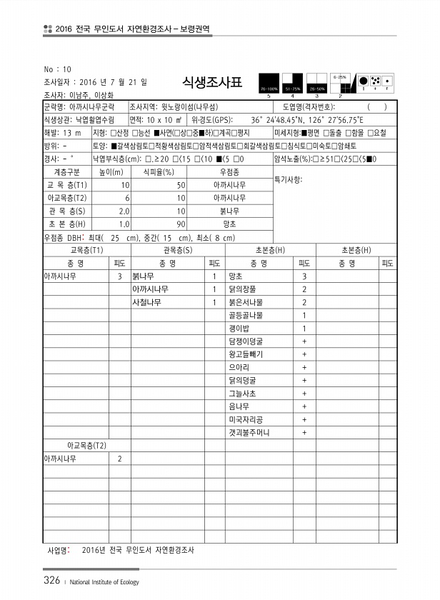 2016 전국 무인도서 자연환경조사 보령권역 326 ? National Institute of Ecology No 10 조사일자 2016 년 7 월 21 일 조사자이남주, 이상화 식생조사표 군락명아까시나무군락 조사지역윗노랑이섬 나무섬 도엽명 격자번호 식생상관낙엽활엽수림 면적10 x 10 ㎡ 위?경도 GPS 36°2448.45N, 126°2756.75E 해발13 m 지형□산정 □능선 ■사면 □상□중■하 □계곡□평지 미세지형■평면 □돌출 □함몰 □요철 방위토양■갈색삼림토□적황색삼림토□암적색삼림토□회갈색삼림토□침식토□미숙토□암쇄토 경사° 낙엽부식층 cm □.≥20 □ 15 □ 10 ■ 5 □0 암석노출 % □≥51□ 25□ 5■0 계층구분 높이 m 식피율 % 우점종 특기사항교 목 층 T1 10 50 아까시나무 아...