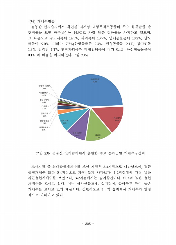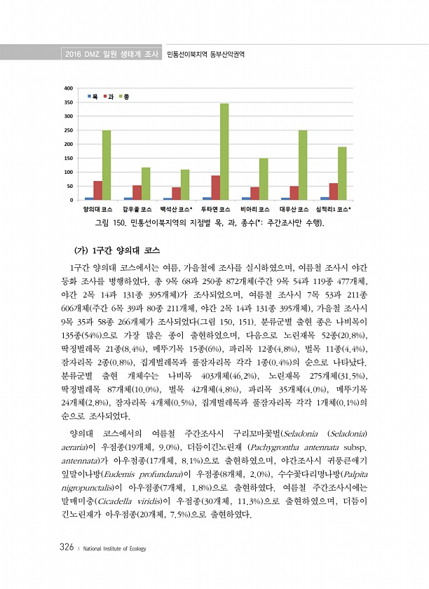 2016 DMZ 일원 생태계 조사 민통선이북지역 동부산악권역 326 ? National Institute of Ecology 그림 150. 민통선이북지역의 지점별 목, 과, 종수 *주간조사만 수행 가 1구간 양의대 코스 1구간 양의대 코스에서는 여름, 가을철에 조사를 실시하였으며, 여름철 조사시 야간 등화 조사를 병행하였다. 총 9목 68과 250종 872개체 주간 9목 54과 119종 477개체, 야간 2목 14과 131종 395개체 가 조사되었으며, 여름철 조사시 7목 53과 211종 606개체 주간 6목 39과 80종 211개체, 야간 2목 14과 131종 395개체 , 가을철 조사시 9목 35과 58종 266개체가 조사되었다 그림 150, 151 분류군별 출현 종은 나비목이 135종 54% 으로 가장...