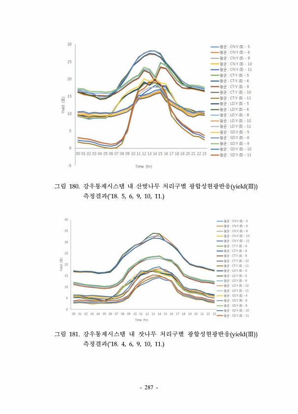 287 그림 180. 강우통제시스템 내 산벚나무 처리구별 광합성현광반응 yield Ⅲ 측정결과 ‘18. 5, 6, 9, 10, 11. 그림 181. 강우통제시스템 내 잣나무 처리구별 광합성현광반응 yield Ⅲ 측정결과 ‘18. 4, 6, 9, 10, 11.