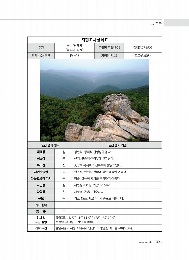 Ⅲ. 부록 www.nie.re.kr ? 325 지형조사상세표 구간 화방재댓재 화방재피재 도엽명 도엽번호 함백 378162 격자번호-연번 E4-02 지형명 기호 토르 GM05 등급 평가 항목 등급 평가 기준 대표성 상 성인적, 형태적 전형성이 높다. 희소성 중 산지, 구릉의 산정부에 발달한다. 특이성 상 중함백 북서쪽의 산록부에 발달하였다. 재현가능성 상 환경적, 인위적 변화에 의한 회복이 어렵다. 학술?교육적 가치 중 학술, 교육적 가치를 부여하기 어렵다. 자연성 상 자연상태로 잘 보존되어 있다. 다양성 하 지형의 구성이 단순하다. 규모 중 가로 18m, 세로 4m의 중규모 지형이다. 기타 항목 등 급 Ⅲ 위치 및 사진 설명 촬영지점 N37° 1014.5E128° 5449.5중함백은대봉 구간의 토르이다. 기...