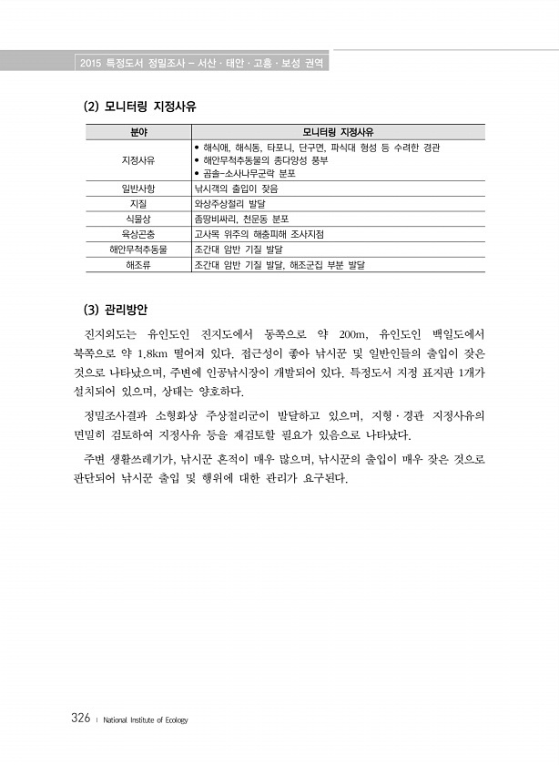 2015 특정도서 정밀조사 서산·태안·고흥·보성 권역 326 ? National Institute of Ecology 2 모니터링 지정사유 분야 모니터링 지정사유 지정사유 ? 해식애, 해식동, 타포니, 단구면, 파식대 형성 등 수려한 경관 ? 해안무척추동물의 종다양성 풍부 ? 곰솔-소사나무군락 분포 일반사항 낚시객의 출입이 잦음 지질 와상주상절리 발달 식물상 좀땅비싸리, 천문동 분포 육상곤충 고사목 위주의 해충피해 조사지점 해안무척추동물 조간대 암반 기질 발달 해조류 조간대 암반 기질 발달, 해조군집 부분 발달 3 관리방안 진지외도는 유인도인 진지도에서 동쪽으로 약 200m, 유인도인 백일도에서 북쪽으로 약 1.8km 떨어져 있다. 접근성이 좋아 낚시꾼 및 일반인들의 출입이 잦은 것으로 나타났으며, 주변에 ...