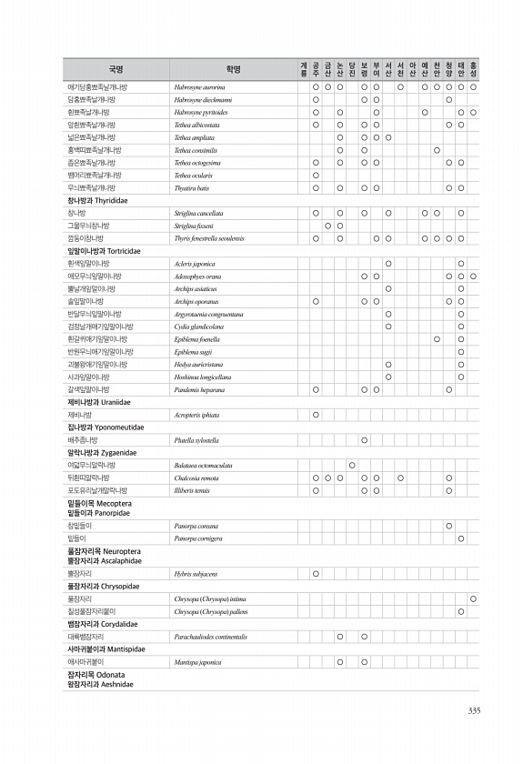335 애기담홍뾰족날개나방 Habrosyne aurorina ○ ○ ○ ○ ○ ○ ○ ○ ○ ○ ○ 담홍뾰족날개나방 Habrosyne dieckmanni ○ ○ ○ ○ 흰뾰족날개나방 Habrosyne pyritoides ○ ○ ○ ○ ○ ○ 앞흰뾰족날개나방 Tethea albicostata ○ ○ ○ ○ ○ ○ 넓은뾰족날개나방 Tethea ampliata ○ ○ ○ ○ 홍백띠뾰족날개나방 Tethea consimilis ○ ○ ○ 좁은뾰족날개나방 Tethea octogesima ○ ○ ○ ○ ○ ○ 뱀머리뾰족날개나방 Tethea ocularis ○ 무늬뾰족날개나방 Thyatira batis ○ ○ ○ ○ ○ ○ 창나방과 Thyrididae 창나방 Striglina cancellata ○ ○ ○ ○ ○ ○ ○ ...