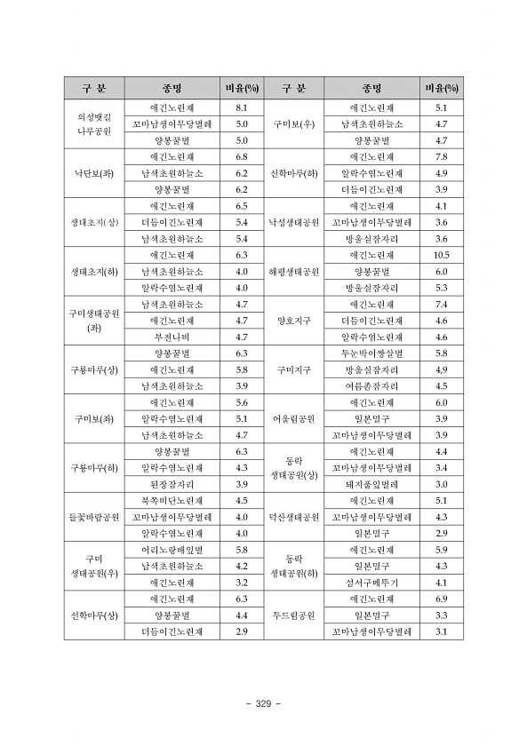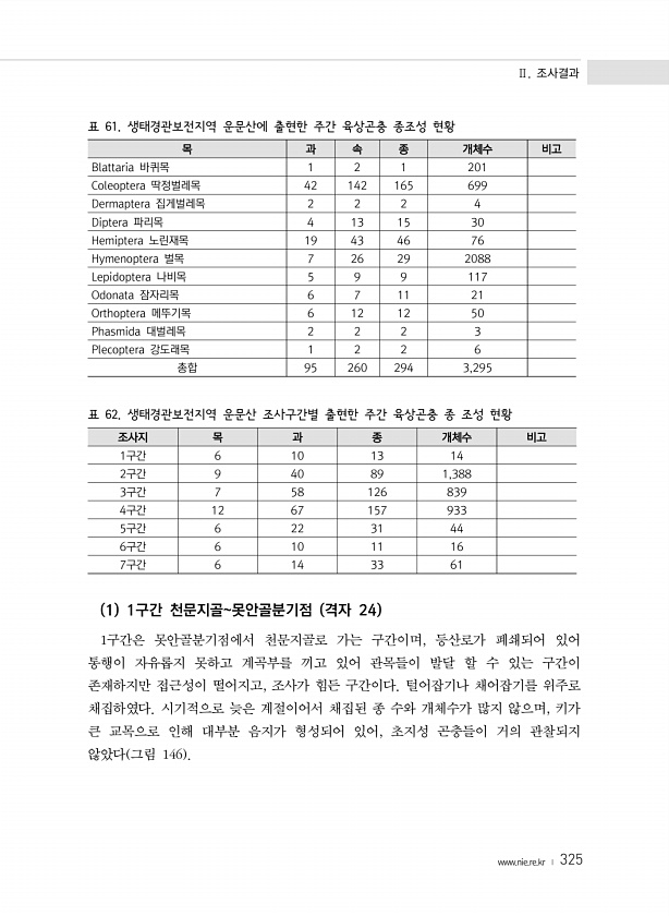 Ⅱ. 조사결과 www.nie.re.kr ? 325 표 61. 생태경관보전지역 운문산에 출현한 주간 육상곤충 종조성 현황 목 과 속 종 개체수 비고 Blattaria 바퀴목 1 2 1 201 Coleoptera 딱정벌레목 42 142 165 699 Dermaptera 집게벌레목 2 2 2 4 Diptera 파리목 4 13 15 30 Hemiptera 노린재목 19 43 46 76 Hymenoptera 벌목 7 26 29 2088 Lepidoptera 나비목 5 9 9 117 Odonata 잠자리목 6 7 11 21 Orthoptera 메뚜기목 6 12 12 50 Phasmida 대벌레목 2 2 2 3 Plecoptera 강도래목 1 2 2 6 총합 95 260 294 3,295 표 62. 생태경관보전지역 운문...