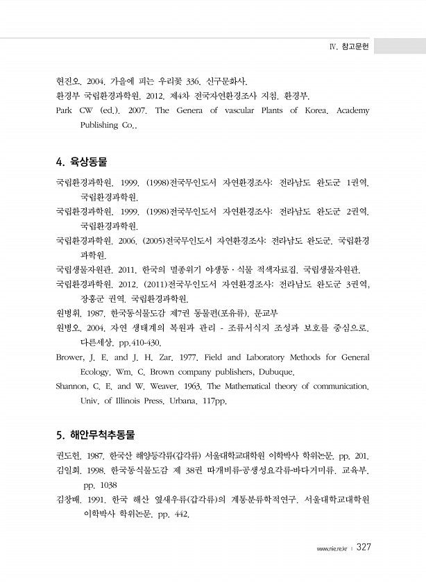 Ⅳ. 참고문헌 www.nie.re.kr ? 327 현진오. 2004. 가을에 피는 우리꽃 336. 신구문화사. 환경부 국립환경과학원. 2012. 제4차 전국자연환경조사 지침. 환경부. Park CW ed. 2007. The Genera of vascular Plants of Korea. Academy Publishing Co.. 4. 육상동물 국립환경과학원. 1999. 1998 전국무인도서 자연환경조사전라남도 완도군 1권역. 국립환경과학원. 국립환경과학원. 1999. 1998 전국무인도서 자연환경조사전라남도 완도군 2권역. 국립환경과학원. 국립환경과학원. 2006. 2005 전국무인도서 자연환경조사전라남도 완도군. 국립환경 과학원. 국립생물자원관. 2011. 한국의 멸종위기 야생동·식물 적색자료집. 국립생물...