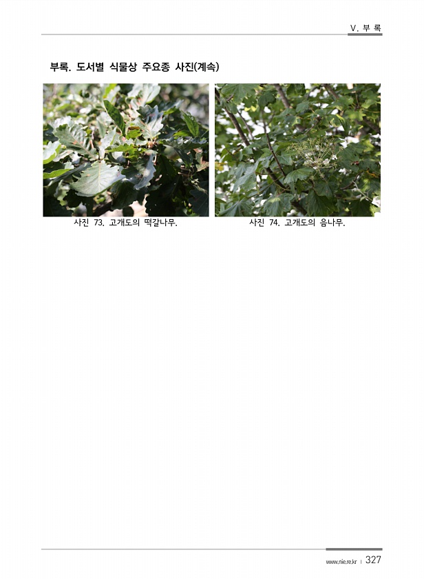 Ⅴ. 부 록 www.nie.re.kr ? 327 부록. 도서별 식물상 주요종 사진 계속 사진 73. 고개도의 떡갈나무. 사진 74. 고개도의음나무.