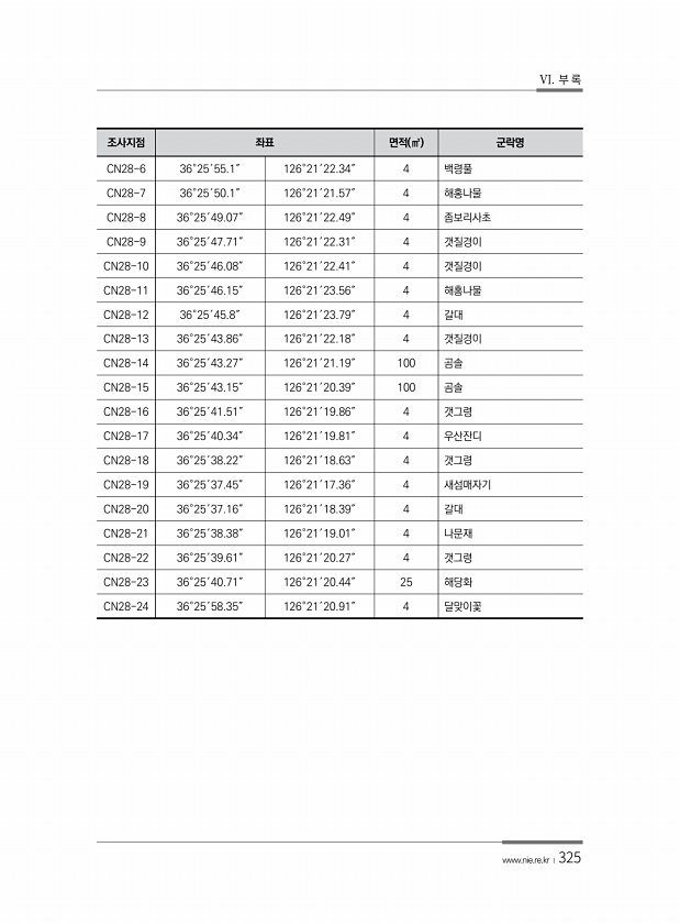 VI. 부 록 www.nie.re.kr ?325 조사지점 좌표 면적 ㎡ 군락명 CN28-6 36°25′55.1″ 126°21′22.34″ 4 백령풀 CN28-7 36°25′50.1″ 126°21′21.57″ 4 해홍나물 CN28-8 36°25′49.07″ 126°21′22.49″ 4 좀보리사초 CN28-9 36°25′47.71″ 126°21′22.31″ 4 갯질경이 CN28-10 36°25′46.08″ 126°21′22.41″ 4 갯질경이 CN28-11 36°25′46.15″ 126°21′23.56″ 4 해홍나물 CN28-12 36°25′45.8″ 126°21′23.79″ 4 갈대 CN28-13 36°25′43.86″ 126°21′22.18″ 4 갯질경이 CN28-14 36°25′43.27″ 126°21′2...