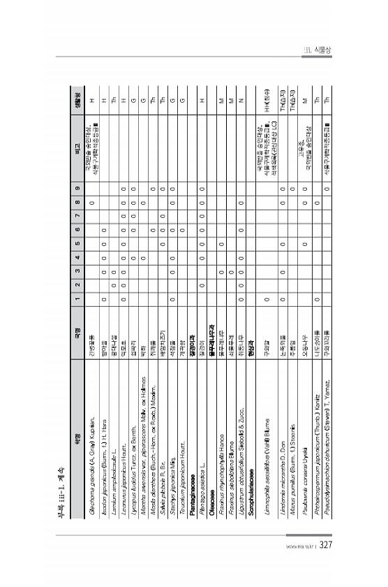 327 학명 국명 1 2 3 4 5 6 7 8 9 비고 생활형 Glechoma grandis A. Gray Kuprian. 긴병꽃풀 0 국외반출 승인대상, 식물구계학적종등급Ⅲ H Isodon japonicus Burm. f. H. Hara 방아풀 0 0 0 0 0 H Lamium amplexicaule L. 광대나물 0 0 Th Leonurus japonicus Houtt. 익모초 0 0 0 0 0 0 0 0 0 H Lycopus lucidus Turcz. ex Benth. 쉽싸리 0 0 0 0 0 G Mentha arvensis var. piperascens Malv. ex Holmes 박하 0 0 G Mosla dianthera Buch.-Ham. ex Roxb. Maxim. 쥐깨풀 0 0 Th Salv...