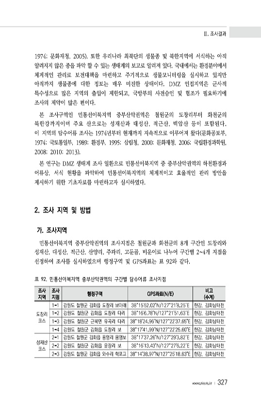 Ⅱ. 조사결과 www.nie.re.kr ? 327 조사 지역 조사 지점 행정구역 GPS좌표 N/E 수계 비고 도창리 코스 1-1 강원도 철원군 김화읍 도창리 보아래 38°1552.02N/127°218.25E 한강, 김화남대천 1-2 강원도 철원군 김화읍 도창리 다리 38°166.78N/127°2151.63E 한강, 김화남대천 1-3 강원도 철원군 근북면 유곡리 다리 38°1824.96N/127°2237.65E 한강, 김화남대천 1-4 강원도 철원군 김화읍 도창리 보 38°1741.99N/127°2225.60E 한강, 김화남대천 성재산 코스 2-1 강원도 철원군 김화읍 용영리 용영보 38°1737.26N/127°293.82E 한강, 김화남대천 2-2 강원도 철원군 김화읍 운장리 보 38°1613.43N/127...