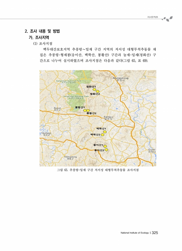 저서무척추 National Institute of EcologyⅠ325 2. 조사 내용 및 방법 가. 조사지역 1 조사지점 백두대간보호지역 추풍령∼밀재 구간 지역의 저서성 대형무척추동물 채 집은 추풍령형제봉 웅이산, 백학산, 봉황산 구간과 늘재밀재 청화산 구 간으로 나누어 실시하였으며 조사지점은 다음과 같다 그림 65, 표 69 그림 65. 추풍령밀재 구간 저서성 대형무척추동물조사지점