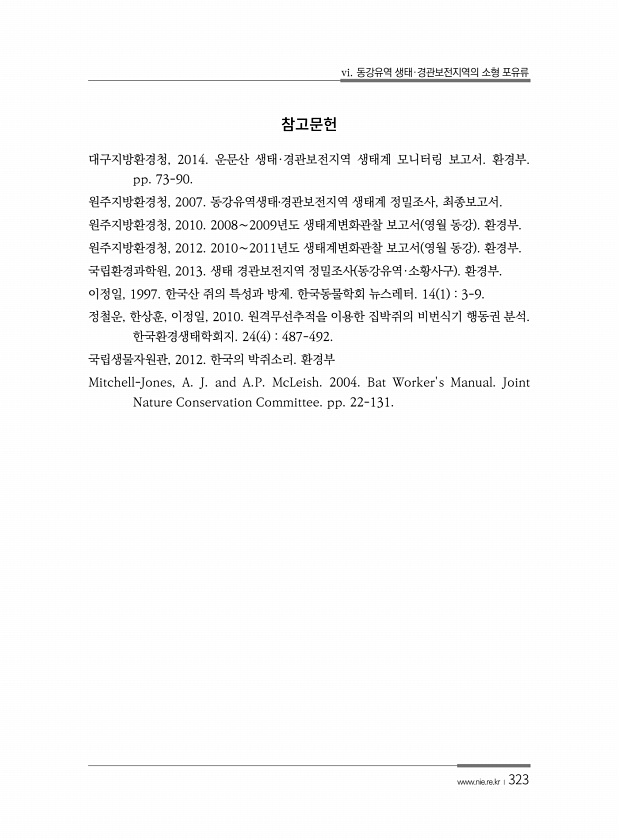 vi. 동강유역 생태·경관보전지역의 소형 포유류 www.nie.re.kr ?323 대구지방환경청, 2014. 운문산 생태·경관보전지역 생태계 모니터링 보고서. 환경부. pp. 73-90. 원주지방환경청, 2007. 동강유역생태?경관보전지역 생태계 정밀조사, 최종보고서. 원주지방환경청, 2010. 2008∼2009년도 생태계변화관찰 보고서 영월 동강 환경부. 원주지방환경청, 2012. 2010∼2011년도 생태계변화관찰 보고서 영월 동강 환경부. 국립환경과학원, 2013. 생태 경관보전지역 정밀조사 동강유역·소황사구 환경부. 이정일, 1997. 한국산 쥐의 특성과 방제. 한국동물학회 뉴스레터. 14 1 3-9. 정철운, 한상훈, 이정일, 2010. 원격무선추적을 이용한 집박쥐의 비번식기 행동권 분석. 한국환경...