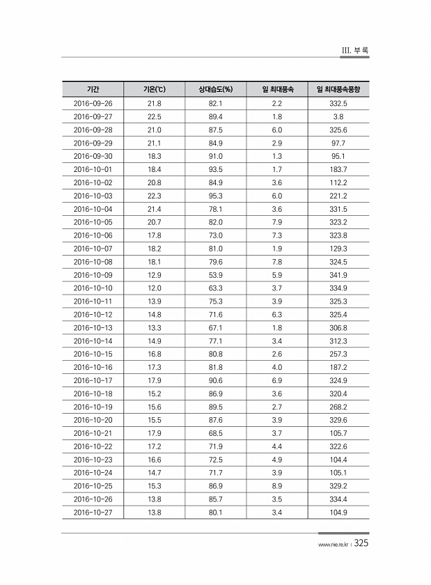 III. 부 록 www.nie.re.kr ?325 기간 기온 ℃ 상대습도 % 일 최대풍속 일 최대풍속풍향 2016-09-26 21.8 82.1 2.2 332.5 2016-09-27 22.5 89.4 1.8 3.8 2016-09-28 21.0 87.5 6.0 325.6 2016-09-29 21.1 84.9 2.9 97.7 2016-09-30 18.3 91.0 1.3 95.1 2016-10-01 18.4 93.5 1.7 183.7 2016-10-02 20.8 84.9 3.6 112.2 2016-10-03 22.3 95.3 6.0 221.2 2016-10-04 21.4 78.1 3.6 331.5 2016-10-05 20.7 82.0 7.9 323.2 2016-10-06 17.8 73.0 7.3 323.8 2016...