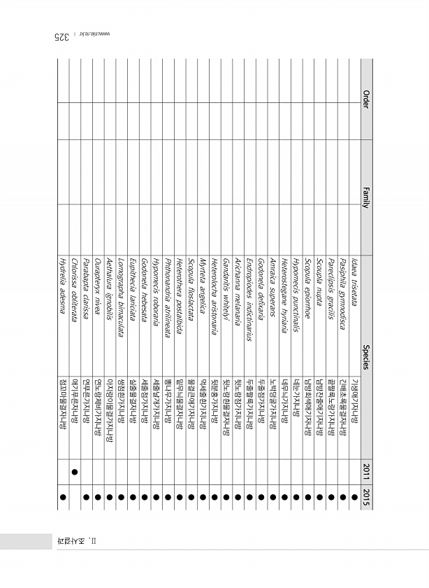 325 Order Family Species 2011 2015 Idaea trisetata 기생애기자나방 ● Pasiphila gymnodisca 긴배초록물결자나방 ● Pareclipsis gracilis 끝짤룩노랑가지나방 ● Scoupla nupta 남방잔줄애기자나방 ● Scopula epiorrhoe 남방회색애기자나방 ● Hypomecis punctinalis 네눈가지나방 ● Heterostegane hyriaria 네무늬가지나방 ● Amraica superans 노박덩굴가지나방 ● Godonela defixaria 두줄점가지나방 ● Endropiodes indictinarius 두줄짤룩가지나방 ● Arichanna melanaria 뒷노랑점가지나방 ● Gandaritis whitelyi 뒷노랑흰물결자나...