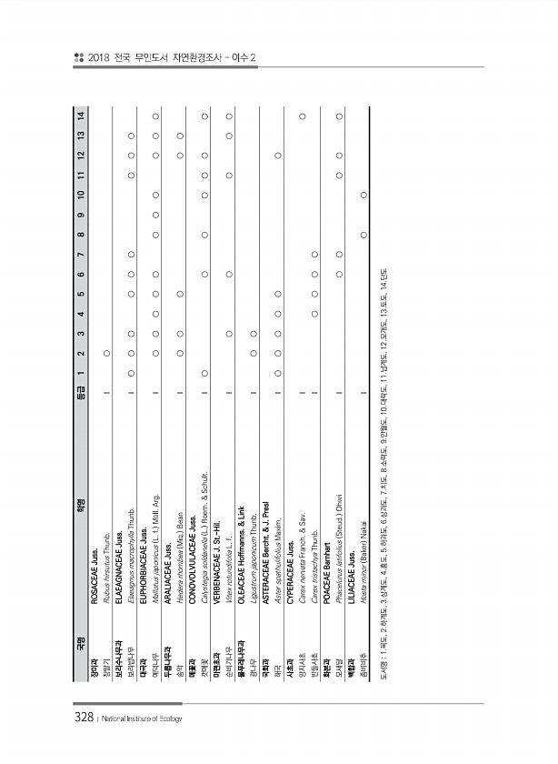 328 도서명 1.목도, 2.하계도, 3.상계도, 4.홍도, 5.하과도, 6.상과도, 7.치도, 8.소락도, 9.만월도, 10.대락도, 11.납계도, 12.모개도, 13.토도, 14.단도 국명 학명 등급 1 2 3 4 5 6 7 8 9 10 11 12 13 14 장미과 ROSACEAE Juss. 장딸기 Rubus hirsutus Thunb. Ⅰ ○ 보리수나무과 ELAEAGNACEAE Juss. 보리밥나무 Elaeagnus macrophylla Thunb. Ⅰ ○ ○ ○ ○ ○ ○ ○ ○ ○ 대극과 EUPHORBIACEAE Juss. 예덕나무 Mallotus japonicus L. f. M?ll. Arg. Ⅰ ○ ○ ○ ○ ○ ○ ○ ○ ○ ○ ○ 두릅나무과 ARALIACEAE Juss. 송악 Hedera r...