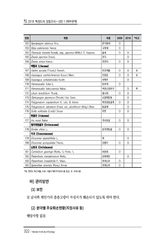 2018 특정도서 정밀조사 신안 1 북부권역 322 ? National Institute of Ecology *특한반도 특산식물, I-Ⅳ식물구계학적 특정식물 등급, 외외래식물 1 섬 남서쪽 해안가의 층층고랭이 자생지가 훼손되지 않도록 해야 한다. 2 해당사항 없음 번호 학명 국명 2009 2018 *비고 162 Spodipogon sibiricus Trin. 큰기름새 O 163 Stipa pekinensis Hance 나래새 O 164 Themeda triandra Forssk. ssp. japonica Willd. T. Koyama 솔새 O O 165 Zoysia japonica Steud. 잔디 O 166 Zoysia sinica Hance 갯잔디 O O 백합과 Liliaceae 167 Aletris s...