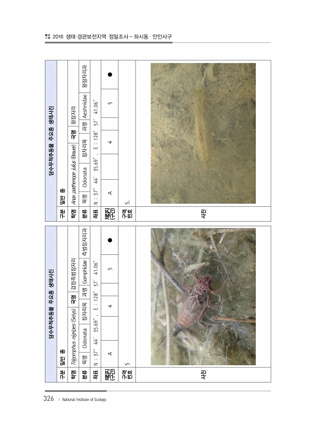 326 담수무척추동물 주요종 생태사진 구분 일반 종 학명 Trigomphus nigripes Selys 국명 검정측범잠자리 분류 목명 Odonata 잠자리목 과명 Gomphidae 측범잠자리과 좌표 N 37° 44′ 35.69″, E 128° 57′ 41.06″ 채집지 구간 A 4 5 ● 구역 번호 5 사진 담수무척추동물 주요종 생태사진 구분 일반 종 학명 Anax parthenope julius Brauer 국명 왕잠자리 분류 목명 Odonata 잠자리목 과명 Aeshnidae 왕잠자리과 좌표 N 37° 44′ 35.69″, E 128° 57′ 41.06″ 채집지 구간 A 4 5 ● 구역 번호 5,사진