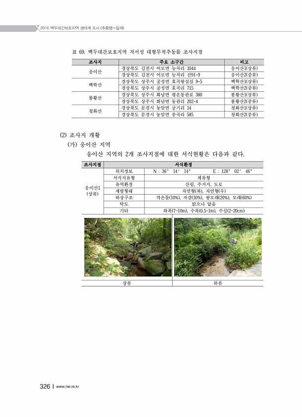 2016 백두대간보호지역 생태계 조사 추풍령밀재 326Ⅰwww.nie.re.kr 조사지 주요 소구간 비고 웅이산 경상북도 김천시 어모면 능치리 1044 웅이산1 상류 경상북도 김천시 어모면 능치리 산91-9 웅이산2 중류 백학산 경상북도 상주시 공성면 효곡왕실길 9-5 백학산1 상류 경상북도 상주시 공성면 효곡리 715 백학산2 중류 봉황산 경상북도 상주시 화남면 평온동관로 380 봉황산1 상류 경상북도 상주시 화남면 동관리 202-4 봉황산2 중류 청화산 경상북도 문경시 농암면 궁기리 14 청화산1 상류 경상북도 문경시 농암면 종곡리 585 청화산2 중류 표 69. 백두대간보호지역 저서성 대형무척추동물 조사지점 2 조사지 개황 가 웅이산 지역 웅이산 지역의 2개 조사지점에 대한 서식현황은 다음과 같다. 조...