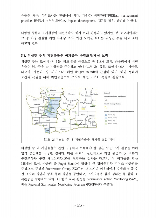 유출수 채수, 화학조사를 진행해야 하며, 다양한 최적관리기법 Best management practice, BMP 과 저영향개발 low impact development, LID 을 적용, 관리해야 한다. 다양한 종류의 조사활동이 지면유출수 허가 아래 진행되고 있지만, 본 보고서에서는 그 중 가장 활발한 지면 유출수 조사, 개선 노력을 보이는 워싱턴 주를 예로 소개 하고자 한다. 3.3. 워싱턴 주의 지면유출수 허가증과 수질조사/개선 노력 워싱턴 주는 도심지 시애틀, 타코마 를 중심으로 총 118개 도시, 카운티에서 지면 유출수 허가증을 받아 규정을 준수하고 있다 그림 2 특히, 도심지 도시시애틀, 타코마, 카운티킹, 피어스 가 해안 Puget sound 에 근접해 있어, 해안 생태계 보전과 복원을 위해 지...