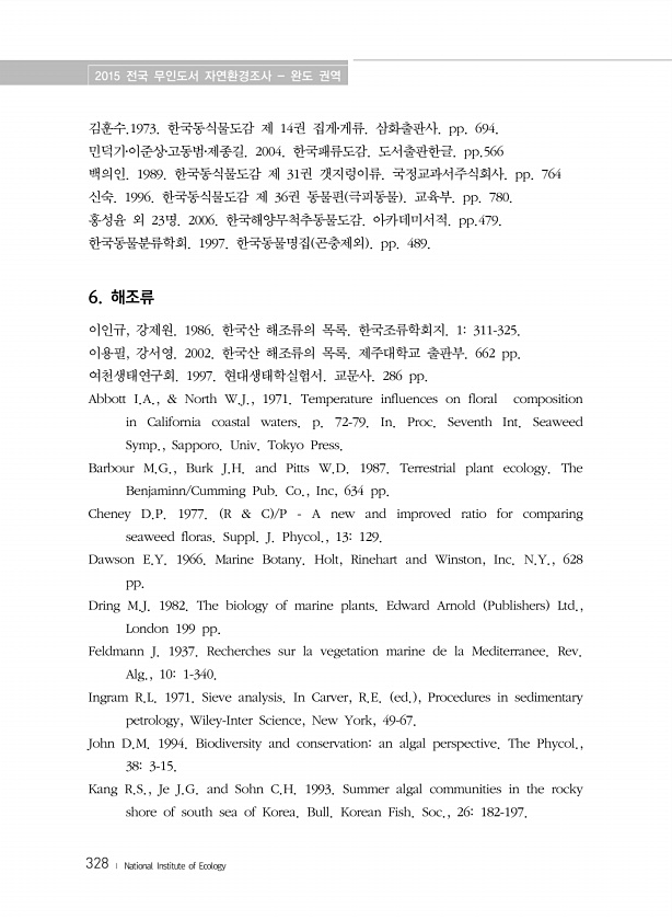 2015 전국 무인도서 자연환경조사 완도 권역 328 ? National Institute of Ecology 김훈수.1973. 한국동식물도감 제 14권 집게?게류. 삼화출판사. pp. 694. 민덕기?이준상?고동범?제종길. 2004. 한국패류도감. 도서출판한글. pp.566 백의인. 1989. 한국동식물도감 제 31권 갯지렁이류. 국정교과서주식회사. pp. 764 신숙. 1996. 한국동식물도감 제 36권 동물편 극피동물 교육부. pp. 780. 홍성윤 외 23명. 2006. 한국해양무척추동물도감. 아카데미서적. pp.479. 한국동물분류학회. 1997. 한국동물명집 곤충제외 pp. 489. 6. 해조류 이인규, 강제원. 1986. 한국산 해조류의 목록. 한국조류학회지. 1311-325. 이용필, 강서영....