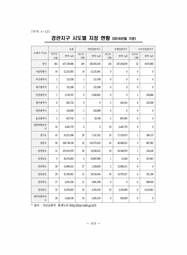 976 [부록 4-12] 경관지구 시도별 지정 현황 2016년말 기준 소재지 시도 소계 자연경관지구 수변경관지구 시가지경관지구 지구수 개 면적 ㎡ 지구수 개 면적 ㎡ 지구수 개 면적 ㎡ 지구수 개 면적 ㎡ 전국 363 427,730,886 203 230,593,156 128 187,264,870 32 9,872,860 서울특별시 19 12,531,891 19 12,531,891 0 0 0 0 부산광역시 1 115,700 1 115,700 0 0 0 0 대구광역시 1 122,208 1 122,208 0 0 0 0 인천광역시 7 2,759,707 6 2,500,901 0 0 1 258,806 광주광역시 8 681,733 0 0 2 459,165 6 222,568 대전광역시 1 243,808 1 243,808 0...
