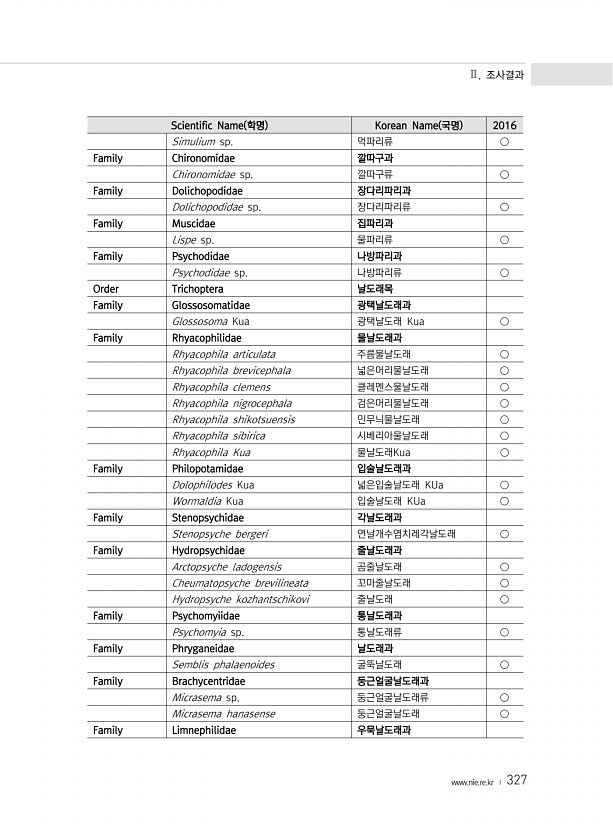 Ⅱ. 조사결과 www.nie.re.kr ? 327 Scientific Name 학명 Korean Name 국명 2016 Simulium sp. 먹파리류 ○ Family Chironomidae 깔따구과 Chironomidae sp. 깔따구류 ○ Family Dolichopodidae 장다리파리과 Dolichopodidae sp. 장다리파리류 ○ Family Muscidae 집파리과 Lispe sp. 물파리류 ○ Family Psychodidae 나방파리과 Psychodidae sp. 나방파리류 ○ Order Trichoptera 날도래목 Family Glossosomatidae 광택날도래과 Glossosoma Kua 광택날도래 Kua ○ Family Rhyacophilidae 물날도래과 Rhyacophila ...