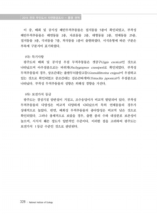 2015 전국 무인도서 자연환경조사 통영 권역 328 ? National Institute of Ecology 이 중, 배회 및 공서성 해안무척추동물은 절지동물 5종이 확인되었고, 부착성 해안무척추동물은 해면동물 2종, 자포동물 2종, 태형동물 2종, 연체동물 25종, 절지동물 3종, 극피동물 7종, 척삭동물 1종이 출현하였다. 서식유형에 따른 구분은 부록에 구분지어 표기하였다. 다 특기사항 광주도의 배회 및 공서성 우점 무척추동물은 갯강구 Ligia exotica 인 것으로 나타났으며 아우점종으로는 바위게 Pachygrapsus crassipes 로 확인되었다. 부착성 무척추동물의 경우, 상조간대는 좁쌀무늬총알고둥 Granulilittorina exigua 이 우점하고 있는 것으로 확인되었고 중조간대는 검...