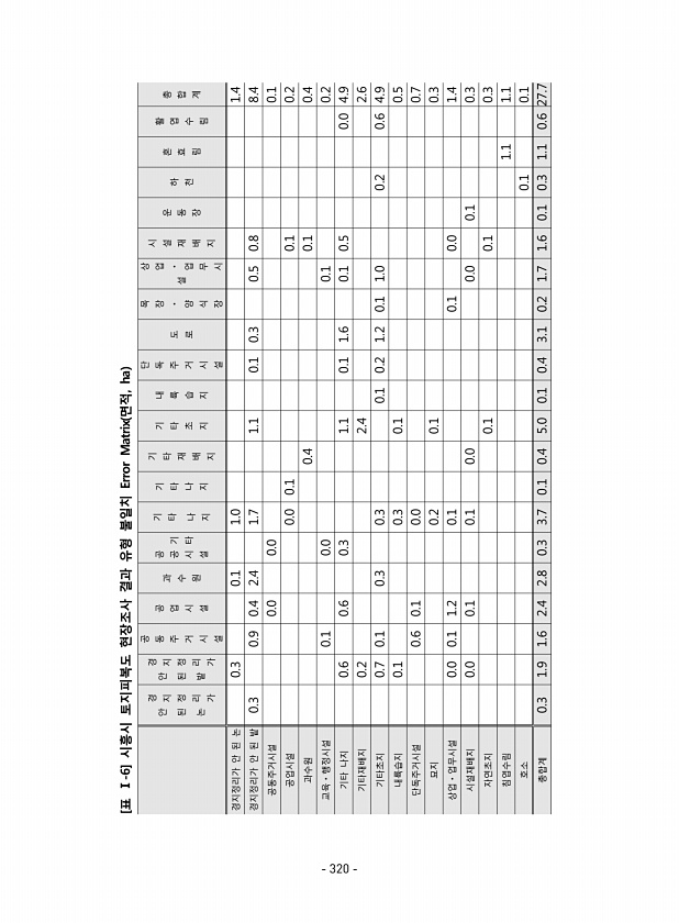 경 지 정 리 가 안 된 논 경 지 정 리 가 안 된 밭 공 동 주 거 시 설 공 업 시 설 과 수 원 기 타 공 공 시 설 기 타 나 지 기 타 나 지 기 타 재 배 지 기 타 초 지 내 륙 습 지 단 독 주 거 시 설 도 로 목 장 ㆍ 양 식 장 상 업 ㆍ 업 무 시 설 시 설 재 배 지 운 동 장 하 천 혼 효 림 활 엽 수 림 총 합 계 경지정리가 안 된 논 0.3 0.1 1.0 1.4 경지정리가 안 된 밭 0.3 0.9 0.4 2.4 1.7 1.1 0.1 0.3 0.5 0.8 8.4 공동주거시설 0.0 0.0 0.1 공업시설 0.0 0.1 0.1 0.2 과수원 0.4 0.1 0.4 교육ㆍ행정시설 0.1 0.0 0.1 0.2 기타 나지 0.6 0.6 0.3 1.1 0.1 1.6 0.1 0.5 0.0 ...