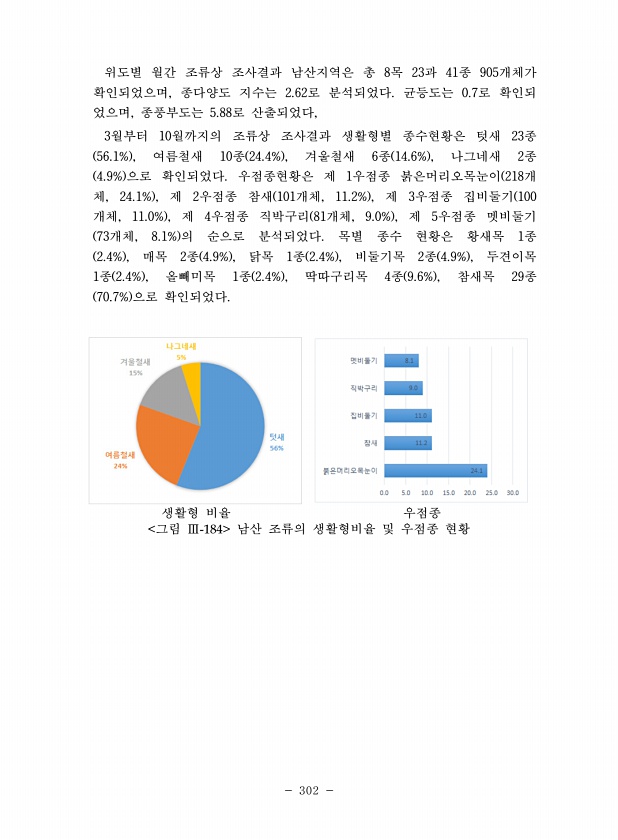 302 위도별 월간 조류상 조사결과 남산지역은 총 8목 23과 41종 905개체가 확인되었으며, 종다양도 지수는 2.62로 분석되었다. 균등도는 0.7로 확인되 었으며, 종풍부도는 5.88로 산출되었다, 3월부터 10월까지의 조류상 조사결과 생활형별 종수현황은 텃새 23종 56.1% , 여름철새 10종 24.4% , 겨울철새 6종 14.6% , 나그네새 2종 4.9% 으로 확인되었다. 우점종현황은 제 1우점종 붉은머리오목눈이 218개 체, 24.1% , 제 2우점종 참새 101개체, 11.2% , 제 3우점종 집비둘기 100 개체, 11.0% , 제 4우점종 직박구리 81개체, 9.0% , 제 5우점종 멧비둘기 73개체, 8.1% 의 순으로 분석되었다. 목별 종수 현황은 황새목 1종 2.4% , 매목 2종 ...