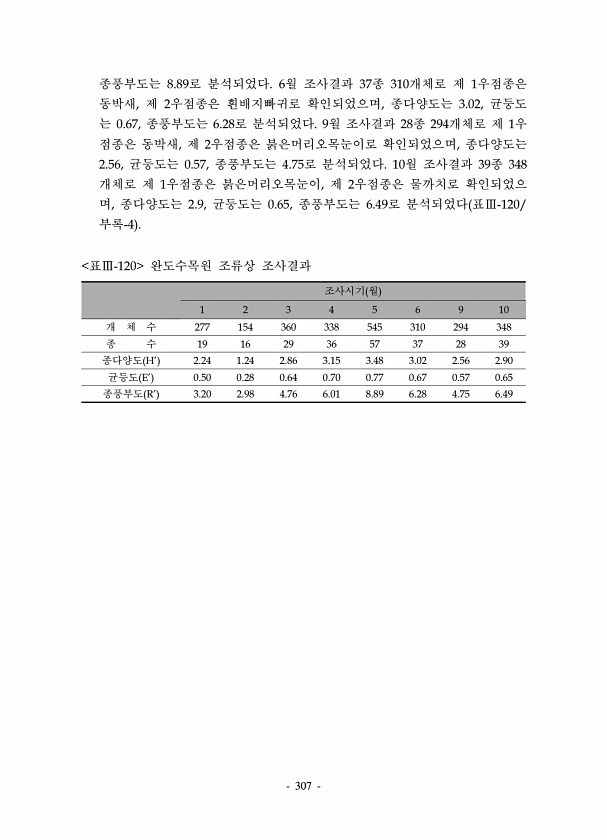 307 종풍부도는 8.89로 분석되었다. 6월 조사결과 37종 310개체로 제 1우점종은 동박새, 제 2우점종은 흰배지빠귀로 확인되었으며, 종다양도는 3.02, 균둥도 는 0.67, 종풍부도는 6.28로 분석되었다. 9월 조사결과 28종 294개체로 제 1우 점종은 동박새, 제 2우점종은 붉은머리오목눈이로 확인되었으며, 종다양도는 2.56, 균둥도는 0.57, 종풍부도는 4.75로 분석되었다. 10월 조사결과 39종 348 개체로 제 1우점종은 붉은머리오목눈이, 제 2우점종은 물까치로 확인되었으 며, 종다양도는 2.9, 균둥도는 0.65, 종풍부도는 6.49로 분석되었다 표Ⅲ-120/ 부록-4 조사시기 월 1 2 3 4 5 6 9 10 개 체 수 277 154 360 338 545 310 294 348 종 ...