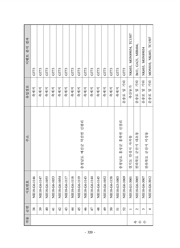 작물 순번 시료번호 주소 유입경로 이벤트 분석 결과 38 NIE18-G6-1146 축제지 GT73 39 NIE18-G6-1147 축제지 GT73 40 NIE18-G6-1055 축제지 GT73 41 NIE18-G6-1053 충청남도 예산군 덕산면 신평리 축제지 GT73 42 NIE18-G6-1054 축제지 GT73 43 NIE18-G6-1117 축제지 GT73 44 NIE18-G6-1118 축제지 GT73 45 NIE18-G6-1119 축제지 GT73 46 NIE18-G6-1143 축제지 GT73 47 NIE18-G6-1144 축제지 GT73 48 NIE18-G6-1145 축제지 GT73 49 NIE18-G6-1052 축제지 GT73 50 NIE18-G6-1158 축제지 GT73 51 NIE18-G3-1003...