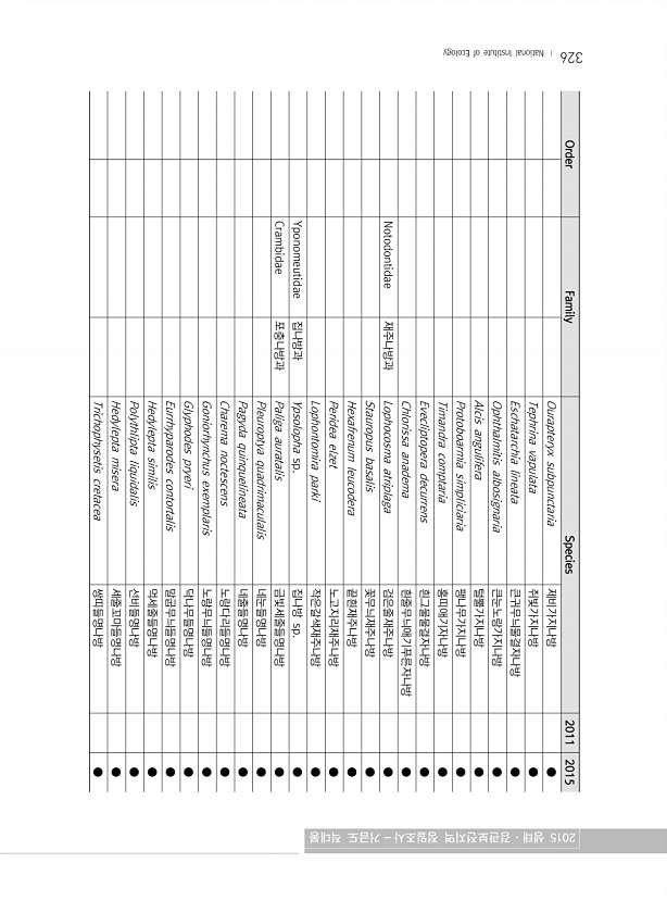 326 Order Family Species 2011 2015 Ourapteryx subpunctaria 제비가지나방 ● Tephrina vapulata 쥐빛가지나방 ● Eschatarchia lineata 큰귀무늬물결자나방 ● Ophthalmitis albosignaria 큰눈노랑가지나방 ● Alcis angulifera 털뿔가지나방 ● Protoboarmia simpliciaria 팽나무가지나방 ● Timandra comptaria 홍띠애기자나방 ● Evecliptopera decurrens 흰그물물결자나방 ● Chlorissa anadema 흰줄무늬애기푸른자나방 ● Notodontidae 재주나방과 Lophocosma atriplaga 검은줄재주나방 ● Stauropus basalis 꽃무늬재주나방 ●...