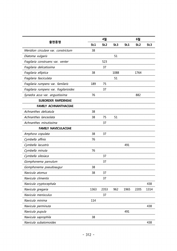 312 출현종명 월4 월6 St.1 St.2 St.3 St.1 St.2 St.3 Meridion circulare var. constrictum 38 Diatoma vulgaris 51 Fragilaria construens var. venter 523 Fragilaria delicatissima 37 Fragilaria elliptica 38 1088 1764 Fragilaria fasciculata 51 Fragilaria rumpens var. familaris 189 75 Fragilaria rumpens var. fragilarioides 37 Synedra acus var. angustissima 76 882 SUBORDER RAPIDINEAE FAMILY ACHNANTHACEAE Achnanth...