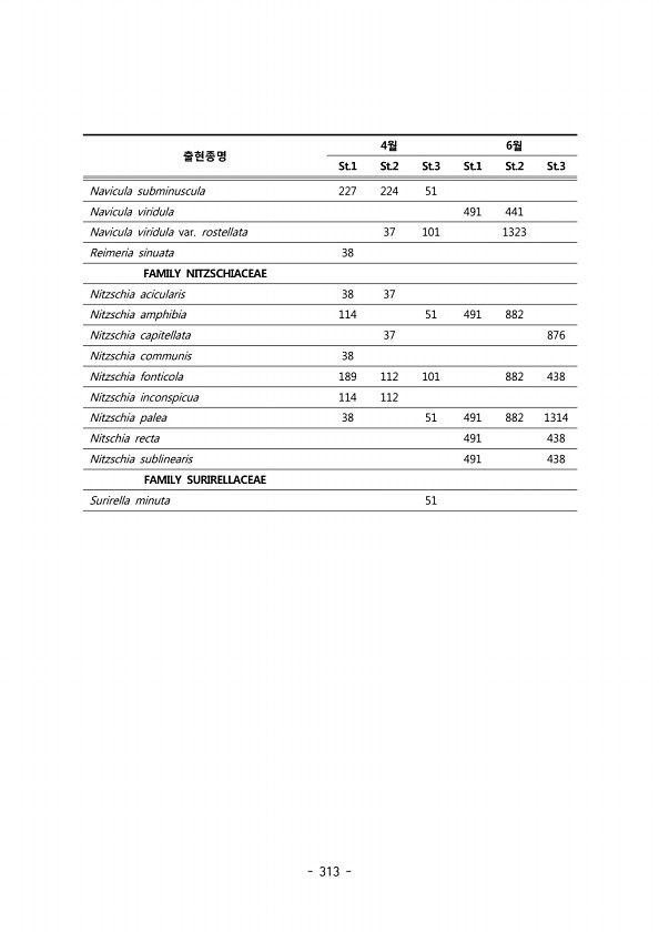 313 출현종명 월4 월6 St.1 St.2 St.3 St.1 St.2 St.3 Navicula subminuscula 227 224 51 Navicula viridula 491 441 Navicula viridula var. rostellata 37 101 1323 Reimeria sinuata 38 FAMILY NITZSCHIACEAE Nitzschia acicularis 38 37 Nitzschia amphibia 114 51 491 882 Nitzschia capitellata 37 876 Nitzschia communis 38 Nitzschia fonticola 189 112 101 882 438 Nitzschia inconspicua 114 112 Nitzschia palea 38 51 491 8...