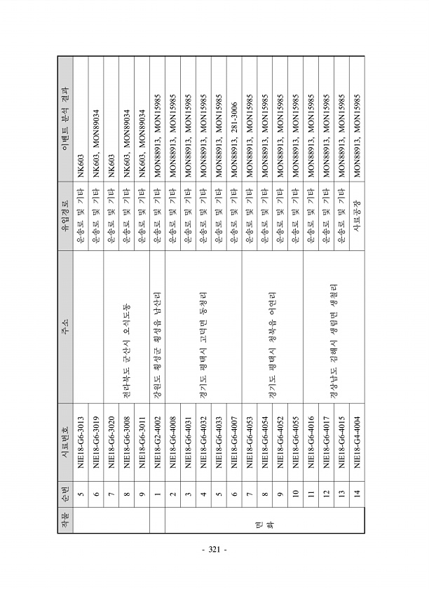 작물 순번 시료번호 주소 유입경로 이벤트 분석 결과 5 NIE18-G6-3013 운송로 및 기타 NK603 6 NIE18-G6-3019 운송로 및 기타 NK603, MON89034 7 NIE18-G6-3020 운송로 및 기타 NK603 8 NIE18-G6-3008 전라북도 군산시 오식도동 운송로 및 기타 NK603, MON89034 9 NIE18-G6-3011 운송로 및 기타 NK603, MON89034 1 NIE18-G2-4002 강원도 횡성군 횡성읍 남산리 운송로 및 기타 MON88913, MON15985 면 화 2 NIE18-G6-4008 경기도 평택시 고덕면 동청리 운송로 및 기타 MON88913, MON15985 3 NIE18-G6-4031 운송로 및 기타 MON88913, MON15985 4 NI...