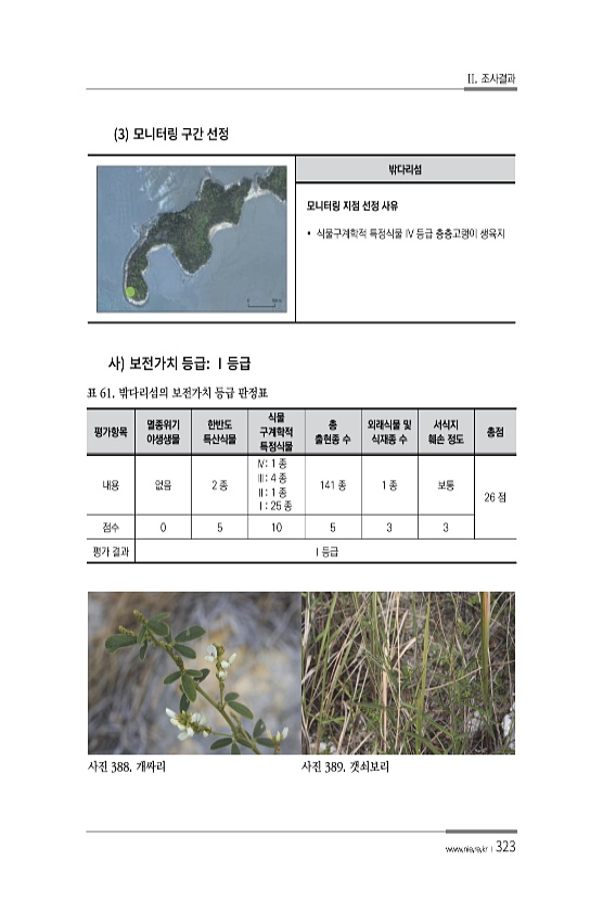 II. 조사결과 www.nie.re.kr ?323 3 밖다리섬 모니터링 지점 선정 사유 ? 식물구계학적 특정식물 IV 등급 층층고랭이 생육지 평가항목 멸종위기 야생생물 한반도 특산식물 식물 구계학적 특정식물 총 출현종 수 외래식물 및 식재종 수 서식지 훼손 정도 총점 내용 없음 2 종 Ⅳ1 종 Ⅲ4 종 Ⅱ1 종 Ⅰ25 종 141 종 1 종 보통 26 점 점수 0 5 10 5 3 3 평가 결과 Ⅰ등급 표 61. 밖다리섬의 보전가치 등급 판정표 사진 388. 개싸리 사진 389.갯쇠보리