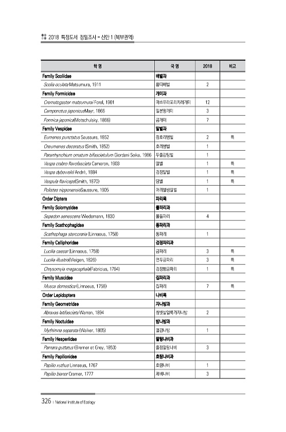 2018 특정도서 정밀조사 신안 1 북부권역 326 ? National Institute of Ecology 학 명 국 명 2018 비고 Family Scoliidae 배벌과 Scolia oculata Matsumura, 1911 황띠배벌 2 Family Formicidae 개미과 Crematogaster matsumurai Forel, 1901 마쓰무라꼬리치레개미 12 Camponotus japonicusMayr, 1866 일본왕개미 3 Formica japonica Motschulsky, 1866 곰개미 7 Family Vespidae 말벌과 Eumenes punctatus Saussure, 1852 점호리병벌 2 특 Oreumenes decoratus Smith, 1852 호리병벌 1 Pararrhyn...