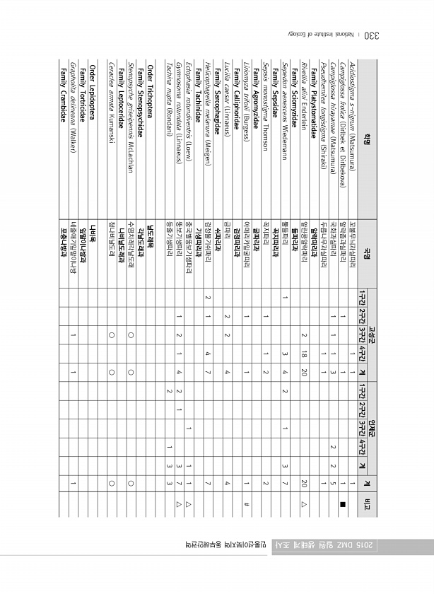 330 학명 국명 고성군 인제군 계 비고 1구간 2구간 3구간 4구간 계 1구간 2구간 3구간 4구간 계 Acidiostigma s-nigrum Matsumura 꼬불무늬과실파리 1 1 1 Campiglossa frolica Dirlbek et Dirlbekova 알락좀과실파리 1 1 1 ■ Campiglossa hirayamae Matsumura 국화과실파리 1 1 1 3 2 2 5 Pseudhemilea longistigma Shiraki 두릅나무과실파리 1 1 1 Family Platystomatidae 알락파리과 Rivellia alini Enderlein 알린콩알락파리 2 18 20 20 △ Family Sciomyzidae 들파리과 Sepedon aenescens Wiedemann 뿔들파리 1 3...