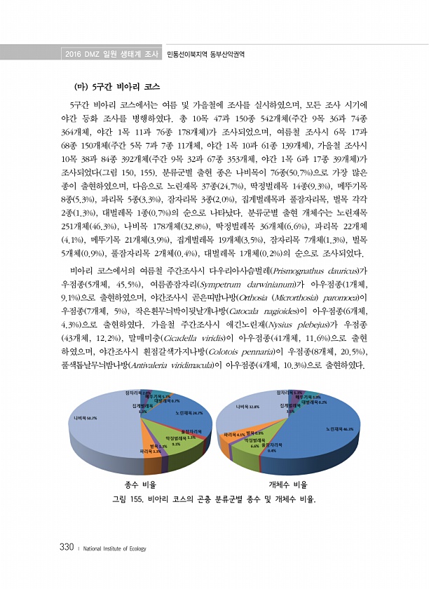 2016 DMZ 일원 생태계 조사 민통선이북지역 동부산악권역 330 ? National Institute of Ecology 마 5구간 비아리 코스 5구간 비아리 코스에서는 여름 및 가을철에 조사를 실시하였으며, 모든 조사 시기에 야간 등화 조사를 병행하였다. 총 10목 47과 150종 542개체 주간 9목 36과 74종 364개체, 야간 1목 11과 76종 178개체 가 조사되었으며, 여름철 조사시 6목 17과 68종 150개체 주간 5목 7과 7종 11개체, 야간 1목 10과 61종 139개체 , 가을철 조사시 10목 38과 84종 392개체 주간 9목 32과 67종 353개체, 야간 1목 6과 17종 39개체 가 조사되었다 그림 150, 155 분류군별 출현 종은 나비목이 76종 50.7% 으로 가장 ...