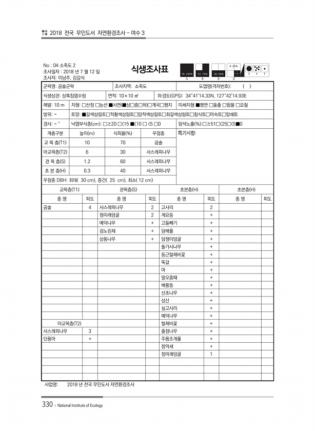 2018 전국 무인도서 자연환경조사 여수 3 330 ? National Institute of Ecology No 04 소죽도 2 조사일자 2018 년 7 월 12 일 조사자이남주, 김갑식 식생조사표 군락명곰솔군락 조사지역소죽도 도엽명 격자번호 식생상관상록침엽수림 면적10×10 ㎡ 위?경도 GPS 34°4114.33N, 127°4214.93E 해발10 m 지형□산정 □능선 ■사면 ■상□중□하 □계곡□평지 미세지형■평면 □돌출 □함몰 □요철 방위토양■갈색삼림토□적황색삼림토□암적색삼림토□회갈색삼림토□침식토□미숙토□암쇄토 경사° 낙엽부식층 cm □≥20 □ 15 ■ 10 □ 5 □0 암석노출 % □≥51□ 25□ 5■0 계층구분 높이 m 식피율 % 우점종 특기사항교 목 층 T1 10 70 곰솔 아교목층 T2 6 ...