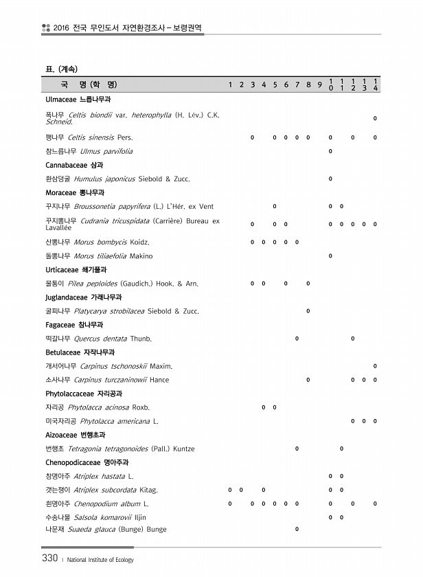 2016 전국 무인도서 자연환경조사 보령권역 330 ? National Institute of Ecology 표. 계속 국 명 학 명 1 2 3 4 5 6 7 8 9 1 0 1 1 1 2 1 3 1 4 Ulmaceae 느릅나무과 폭나무 Celtis biondii var. heterophylla H. L?v. C.K. Schneid. 0 팽나무 Celtis sinensis Pers. 0 0 0 0 0 0 0 0 참느릅나무 Ulmus parvifolia 0 Cannabaceae 삼과 환삼덩굴 Humulus japonicus Siebold & Zucc. 0 Moraceae 뽕나무과 꾸지나무 Broussonetia papyrifera L. L’He?r. ex Vent 0 0 0 꾸지뽕나무 Cudrania tricu...