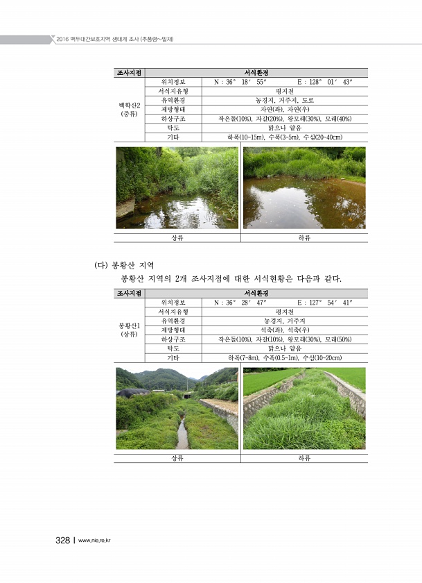2016 백두대간보호지역 생태계 조사 추풍령밀재 328Ⅰwww.nie.re.kr 조사지점 서식환경 백학산2 중류 위치정보 N 36° 18′ 55″ E 128° 01′ 43″ 서식지유형 평지천 유역환경 농경지, 거주지, 도로 제방형태 자연 좌 , 자연 우 하상구조 작은돌 10% , 자갈 20% , 왕모래 30% , 모래 40% 탁도 맑으나 얕음 기타 하폭 1015m , 수폭 35m , 수심 2040cm 상류 하류 다 봉황산 지역 봉황산 지역의 2개 조사지점에 대한 서식현황은 다음과 같다. 조사지점 서식환경 봉황산1 상류 위치정보 N 36° 28′ 47″ E 127° 54′ 41″ 서식지유형 평지천 유역환경 농경지, 거주지 제방형태 석축 좌 , 석축 우 하상구조 작은돌 10% , 자갈 10% , 왕모래 30% ...