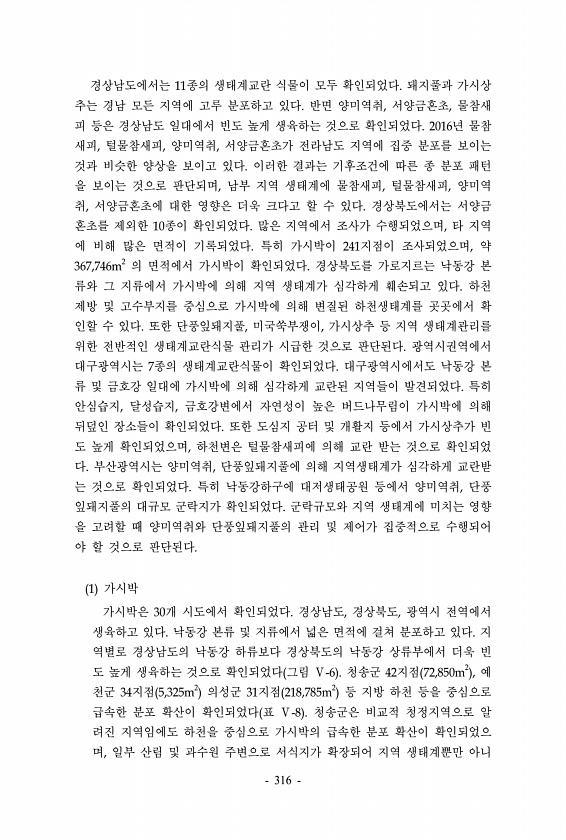 경상남도에서는 11종의 생태계교란 식물이 모두 확인되었다. 돼지풀과 가시상 추는 경남 모든 지역에 고루 분포하고 있다. 반면 양미역취, 서양금혼초, 물참새 피 등은 경상남도 일대에서 빈도 높게 생육하는 것으로 확인되었다. 2016년 물참 새피, 털물참새피, 양미역취, 서양금혼초가 전라남도 지역에 집중 분포를 보이는 것과 비슷한 양상을 보이고 있다. 이러한 결과는 기후조건에 따른 종 분포 패턴 을 보이는 것으로 판단되며, 남부 지역 생태계에 물참새피, 털물참새피, 양미역 취, 서양금혼초에 대한 영향은 더욱 크다고 할 수 있다. 경상북도에서는 서양금 혼초를 제외한 10종이 확인되었다. 많은 지역에서 조사가 수행되었으며, 타 지역 에 비해 많은 면적이 기록되었다. 특히 가시박이 241지점이 조사되었으며, 약 36...